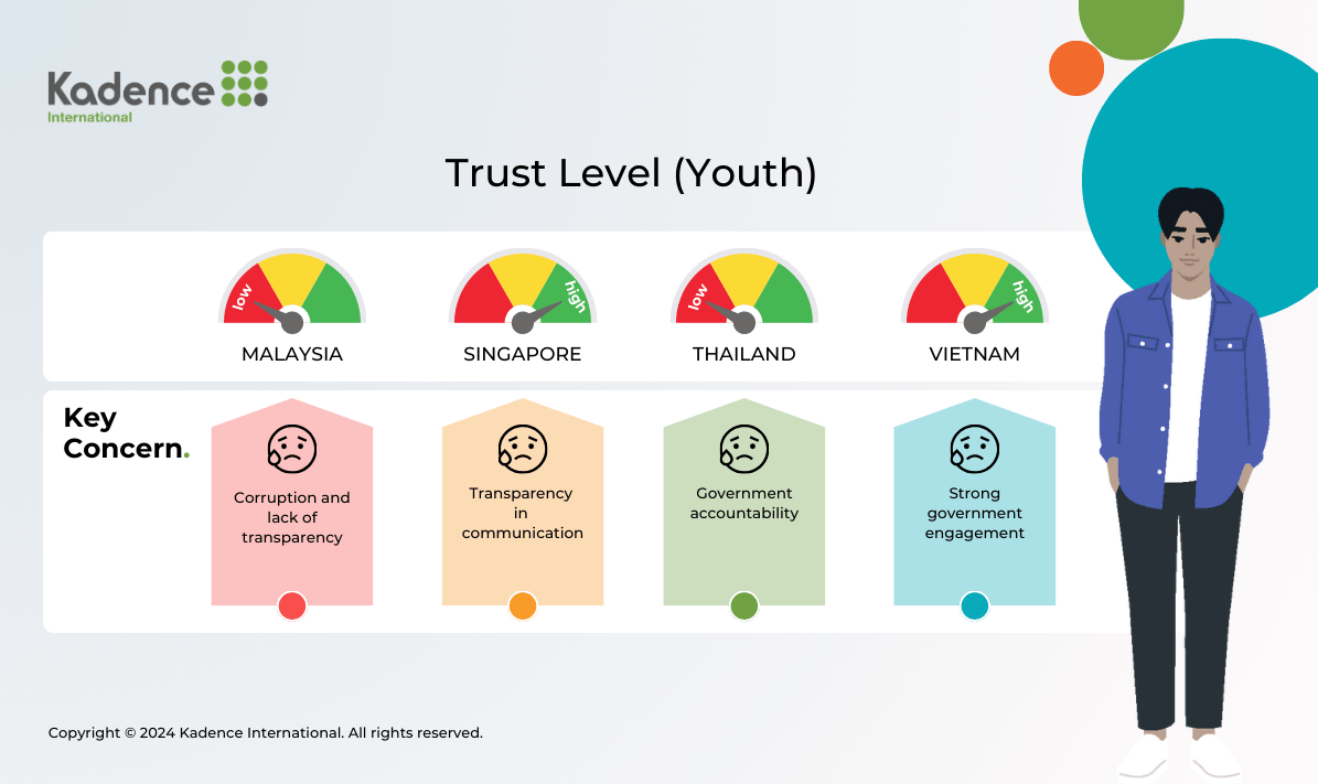 A recent study by Vero Advocacy and Kadence International examined youth attitudes toward governments across Southeast Asia. This research highlights the growing importance of government responsiveness to youth concerns, particularly in areas such as employment opportunities, environmental protection, and the accessibility of affordable housing and healthcare. Trust in government varies across the region, with some countries demonstrating higher levels of youth engagement and confidence while others grapple with transparency issues and civic distrust.