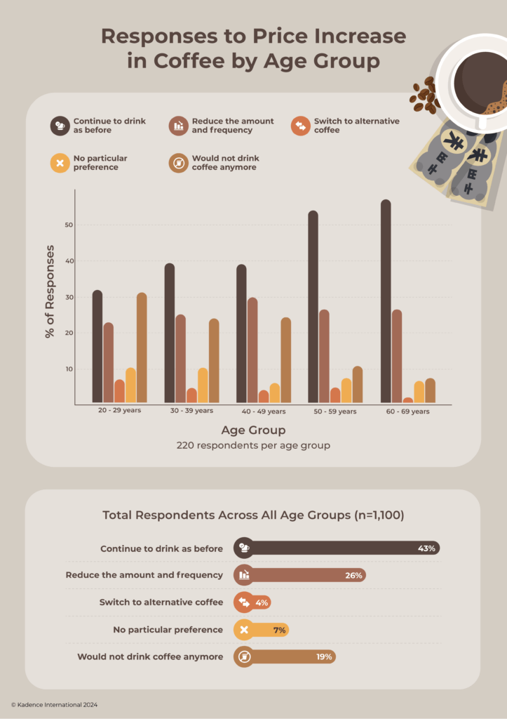 How consumers react to increased costs is telling at a time of fluctuating prices. 43% of respondents indicated they would continue their coffee consumption as usual even if prices rose. This loyalty suggests a deep-seated affection for coffee, particularly among those in their 50s and 60s, more than half of whom would maintain their habits regardless of cost.